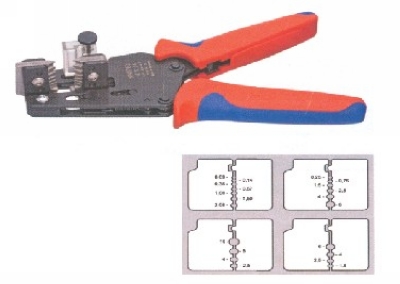 特殊剥线钳,配长度定位器,用于单股线和多股线剥线,剥线范围为0.03-16.0mm2。适用于不同硬度的绝缘材料。特殊的刀刃制造工序,线端不会损伤或变形。根据不同的线径可调换刀片,也可根据顾客要求特殊制定。剥线后刀片自动复位。对 0.03-2.0mm2电缆,喂线装置和剥线模。钳子结构坚固,操作方便。钳子镀铬或抛光处理,采用符合人体工程原理的双材质手柄。840434150适用于太阳能和电缆。