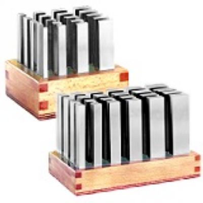 In wooden stand. Plain parallel, fine-ground, in pairs. Size data on front of product. Sets offer a large range with 1 mm graduation. Case-hardened. Pair tolerance tp at height IT 5. Rated dimensional tolerance in height ±0.01 mm. Remaining dimensions to
